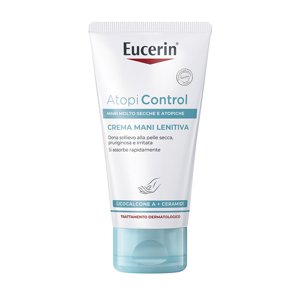 Eucerin AtopiControl Crema Mani leviga e lenisce la pelle. La formula non grassa e che si assorbe velocemente contiene un complesso attivo unico con Licocalcone A lenitivo, Decanediolo antibatterico e Mentoxypropanediolo (MPD) che dona sollievo dal prurito. Questo complesso, combinato con un'elevata concentrazione di Ceramidi ed Avena Sativa (Avena), rafforza la barriera della pelle, riduce la secchezza e dona sollievo alla sensazione di prurito.