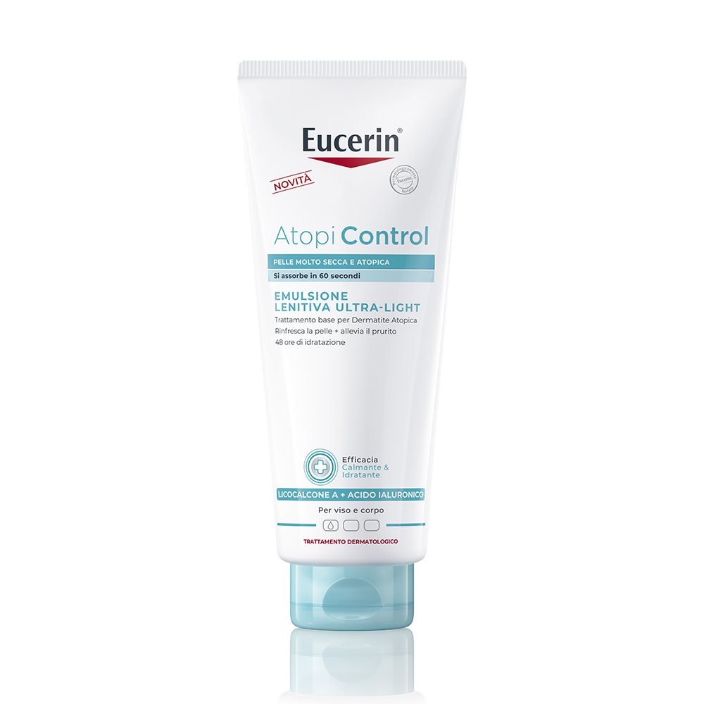 il bisogno di grattarsi, impattando la qualità del sonno e della vita. Eucerin AtopiControl Emulsione Lenitiva Ultra-Light Ultra-Light è un trattamento per il corpo per uso quotidiano, appositamente formulato per lenire e idratare intensamente la pelle irritata e pruriginosa. La sua combinazione di Licochalcone A, Acido Ialuronico e Ceramidi offre un sollievo ad azione rapida, lenisce la pelle irritata e atopica e fornisce un sollievo duraturo. Applicata regolarmente, migliora sensibilmente le condizioni della pelle, rendendola liscia e morbida.La texture ultra-leggera e a rapido assorbimento non appiccica e si applica facilmente, anche in estate e sulle parti del corpo più pelose.Priva di profumo, AtopiControl Emulsione Lenitiva Ultra-Light Ultra-Light può essere utilizzata in combinazione con altri prodotti Eucerin AtopiControl ed è adatta ad adulti e bambini.