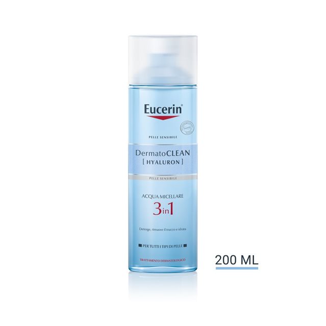Eucerin DermatoCLEAN [HYALURON] Acqua Micellare 3 in 1 è un detergente viso delicato ma efficace che rimuove le impurità ed il trucco viso e occhi senza disidratare la pelle.