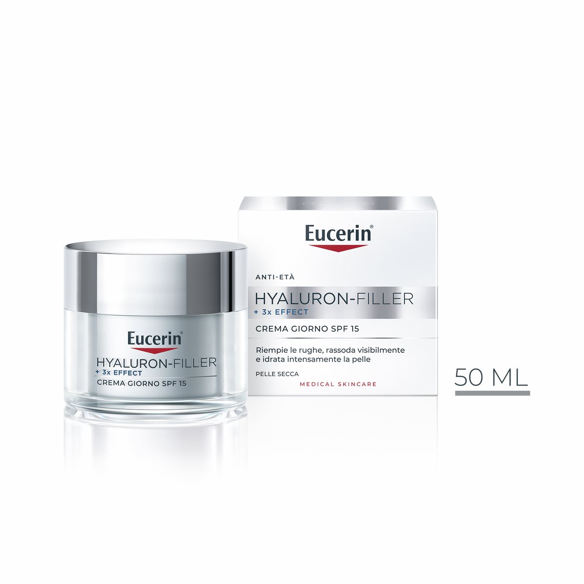 Con il passare del tempo, la capacità della pelle di produrre naturalmente Acido Ialuronico e Collagene diminuisce, causando perdita di compattezza e formazione di rughe. Eucerin Hyaluron-Filler +3x Effect Crema Giorno SPF 15 Pelle Secca, formulata con Acido Ialuronico, idrata la pelle e riempie rughe e linee sottili. Inoltre, grazie alla protezione UVA/UVB ad ampio spettro, previene efficacemente l'invecchiamento precoce causato dal sole.