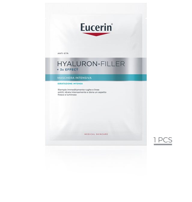 Hyaluron-Filler + 3x Effect Maschera Intensiva La pelle è sottoposta ogni giorno a stress per fattori ambientali, mancanza di idratazione o invecchiamento naturale. Eucerin Hyaluron-Filler +3x Effect Maschera Intensiva è una maschera viso all’Acido Ialuronico che idrata profondamente, riduce rughe e linee sottili e dona alla pelle un aspetto fresco e radioso. Qualunque sia la tua esigenza - maggiore idratazione, tonicità o prevenzione dai segni del tempo - questa maschera risponde alle necessità della tua skincare:
