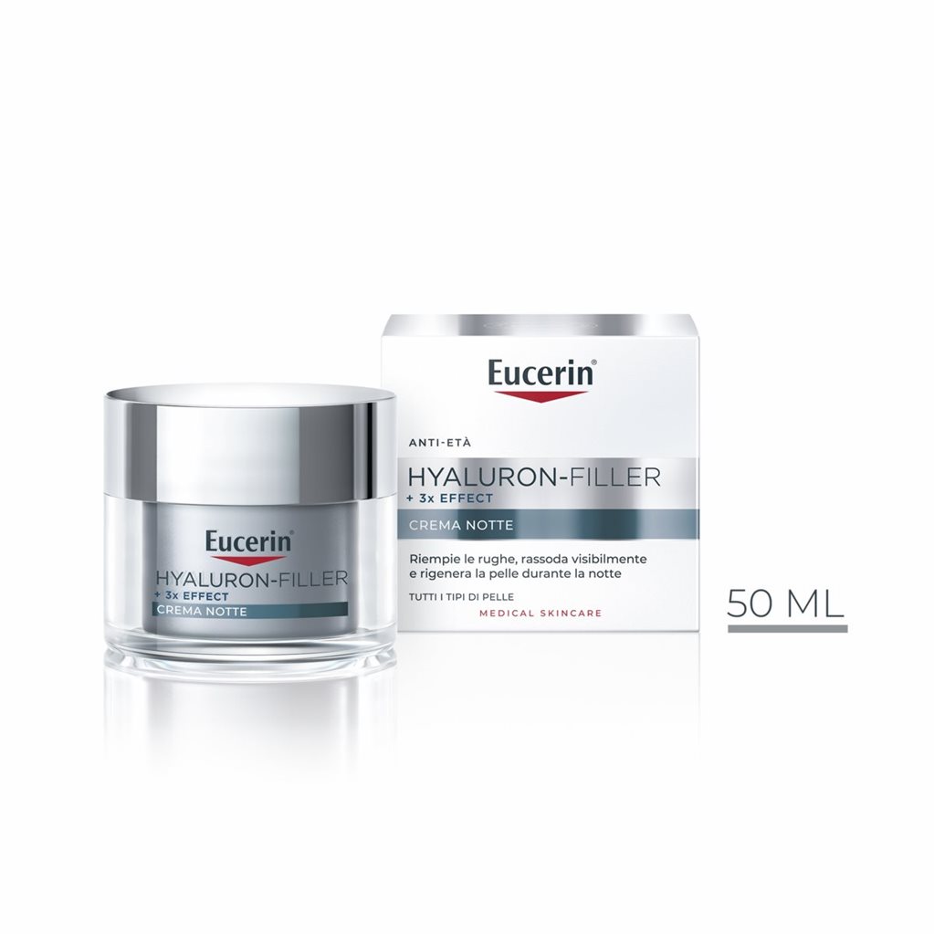 Crema Notte Anti-Età Con il passare del tempo, la capacità della pelle di produrre naturalmente Acido Ialuronico e Collagene diminuisce, causando perdita di compattezza e formazione di rughe. Eucerin Hyaluron-Filler +3x Effect Crema Notte, formulata con Acido Ialuronico, idrata la pelle e riempie rughe e linee sottili. Inoltre, la Glicin-Saponina stimola la naturale produzione di Acido Ialuronico e Collagene per una pelle più tonica e levigata, mentre il Dexpantenolo stimola il processo di rigenerazione durante la notte.