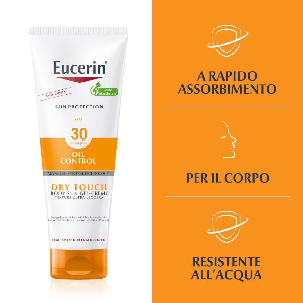 Anti-sabbia significa che è meno probabile che la sabbia  si appiccichi alla pelle usando questo prodotto. Nella ricerca dei consumatori, il 95% dei soggetti concorda che la sabbia non appiccica sulla pelle dopo l'applicazione*. Ecco perchè Eucerin Sun Gel-Creme Dry Touch Oil Control SPF 30 ha una formula ultra leggera che si assorbe velocemente e non appiccica e non è grassa.