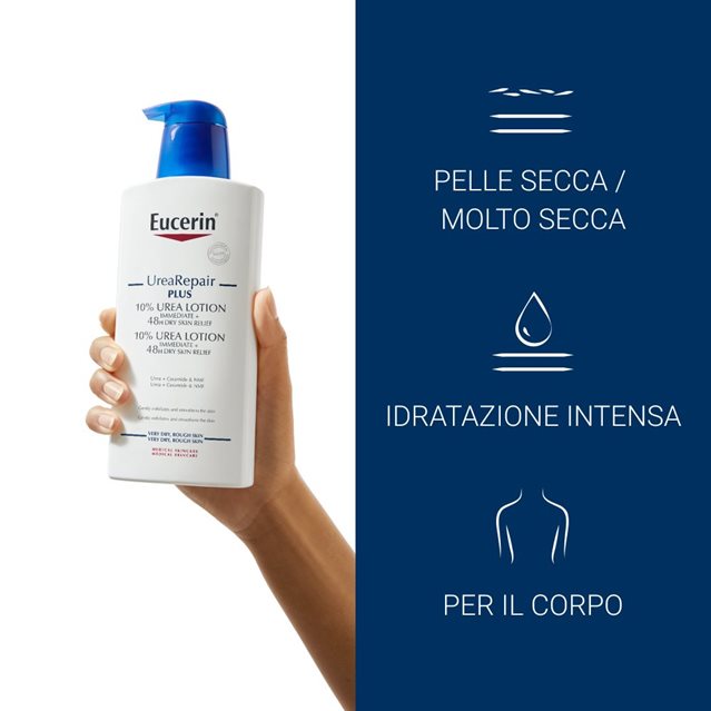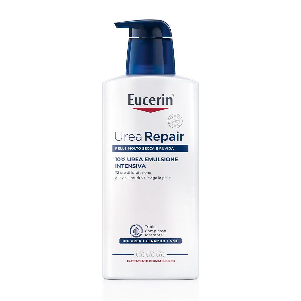 La pelle molto secca può apparire e risultare tesa, arrossata, ruvida, desquamata e pruriginosa. Quando la pelle è secca si riduce la sua capacità di trattenere l'acqua e di prevenire la perdita di idratazione. Per questo motivo è necessario l'utilizzo di una crema per pelle secca sviluppata appositamente per contrastare la secchezza cutanea in modo efficace. Eucerin UreaRepair Emulsione Intensiva 10% Urea per pelle secca dona alla pelle estremamente secca, pruriginosa e desquamata il trattamento quotidiano di cui ha bisogno.